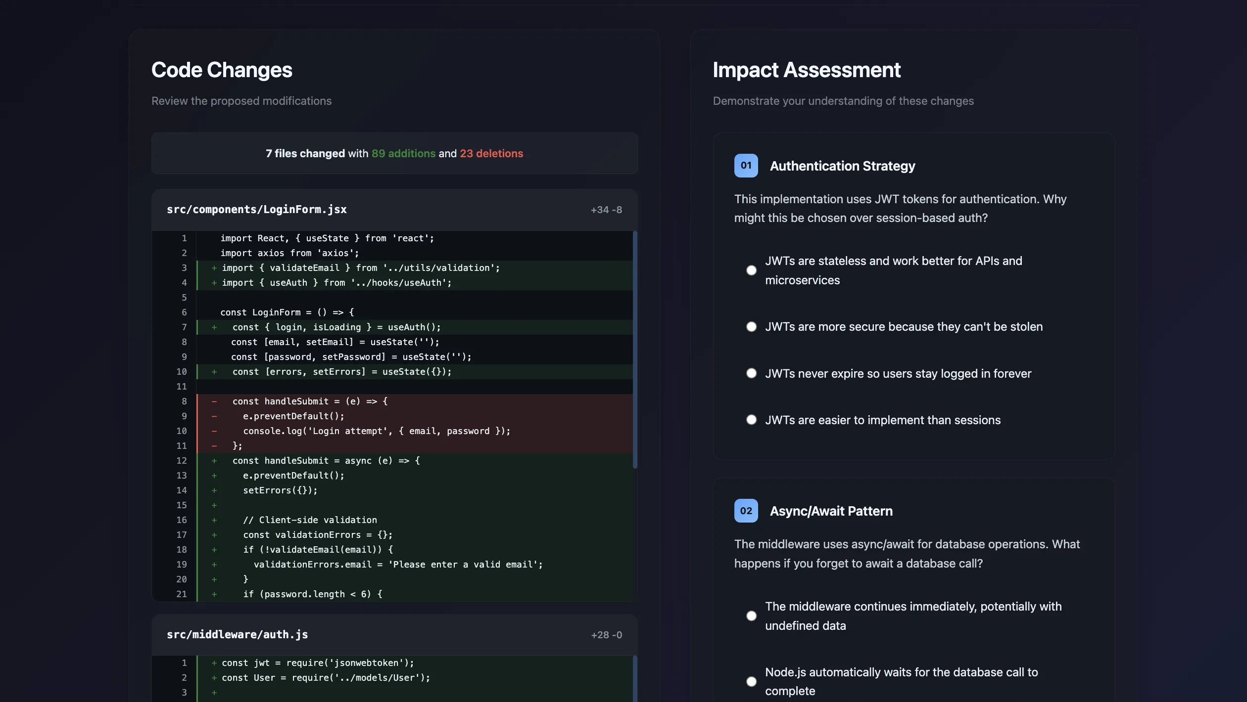 Interactive quizzes that help smart coders learn from the code deeply before they ship. Keep shipping fast WHILE learning deeply.